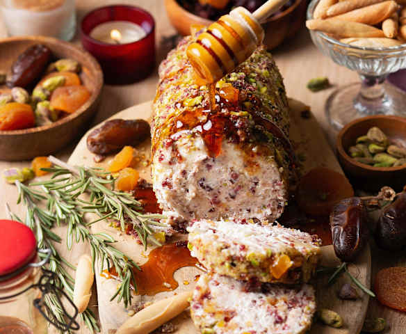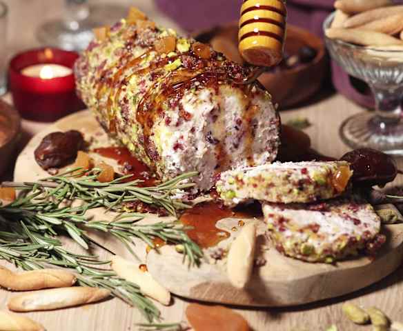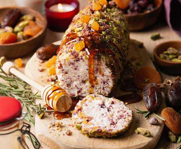 Rollo de queso con nueces y fruta deshidratada