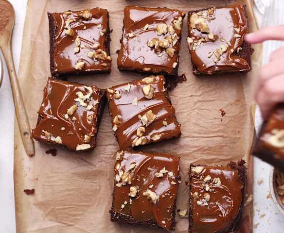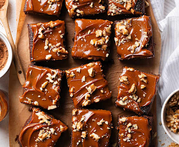 Bizcocho de chocolate, dulce de leche y nueces